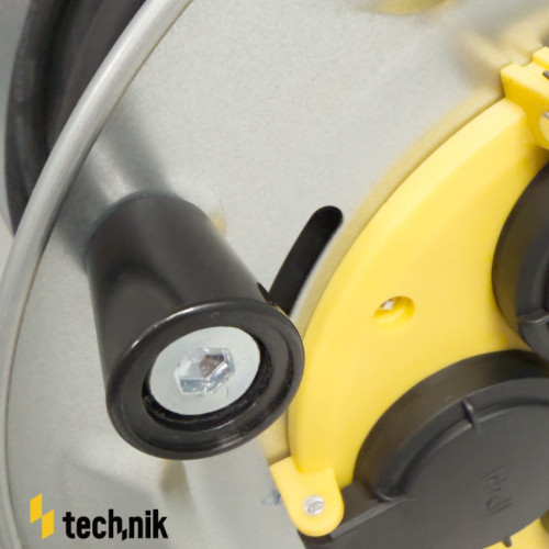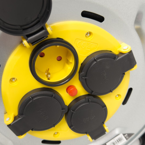 Kabelhaspel met randaarde met 25 meter snoer 3 x 1,5 qmm H07RN-F Neopreen compleet met 4 stopcontacten met klep. Met thermische beveiliging Stevige oprolknop Haspelrem Metalen beugel Maximale belasting opgerold 1200 Watt Maximale belasting uitgerold 3500 Watt IP44 Metalen behuizing Aantal stopcontacten 4 Veiligheid CE Merk Technik