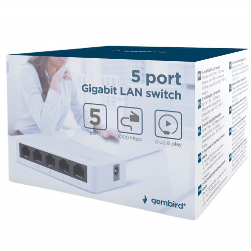 5-poorts Gigabit LAN switch Vijf 10/100/1000 Mbps Ethernet poorten (RJ45 connectors) Alle poorten ondersteunen full/half duplex mode en auto-negotiation Ondersteunt Auto-MDI/MDI-X functie Inclusief voedingsadapter