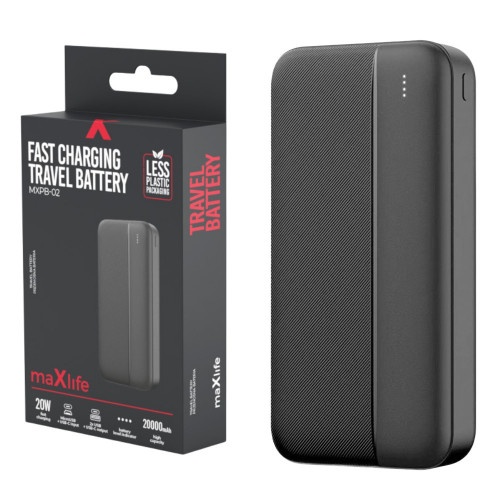 Powerbank 20.000mAh met USB-A + USB-C + micro USB uitgang De Micro USB kabel is inbegrepen. Powerbank van Maxlife met 20.000 mAh. Hoogwaardige moderne Li-Poly cellen zorgen voor vele laadcycli. De buitenbehuizing is gemaakt van plastic en heeft een modern design. Snelle invoer: Opladen via MicroUSB of USB Type-C met QC 5-12V/2 A (20 W). Geschikt voor DUAL laden Met LED-capaciteitsindicatoren Afmetingen 137x70x28mm